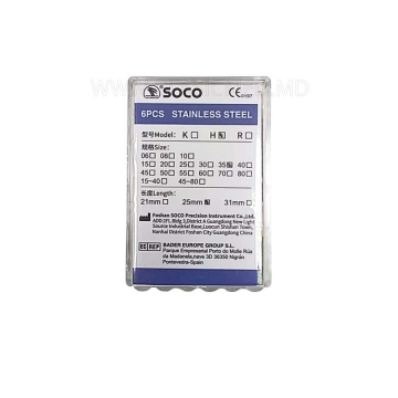 H-Fișiere manuale SOCO #35, 25 mm sunt un instrument endodontic pentru mărirea și penetrarea canalului radicular cu capacitate mare de tăiere (comparativ cu pile K). Au duritate medie. H-Fișierele SOCO Steel sunt recomandate pentru prelucrarea manuală a canalelor radiculare normale ale dintelui. Instrumentele sunt concepute pentru a nivela pereții, extinde și curăța canalele.