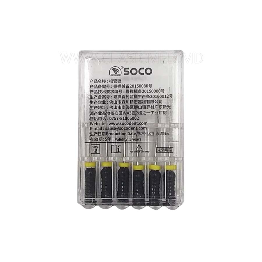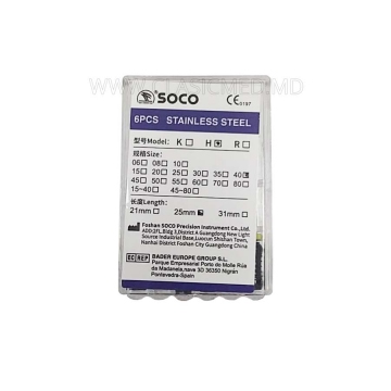 SOCO H-Files sunt realizate din oțel inoxidabil și echipate cu mânere din plastic și dopuri din silicon. Furnizat într-un set de șase pile H. Pilele SOCO H sunt foarte puternice și suficient de flexibile pentru a minimiza riscul de rănire la prelucrarea canalului.