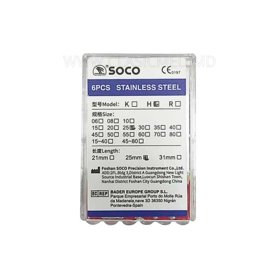 Manual H-Files SOCO #25, 25 mm sunt destinate tratamentului mecanic manual al canalelor radiculare (tașare, aliniere a peretelui, dilatare). Setul contine 6 fisiere.