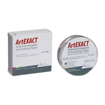Артикуляционная бумага имеет толщину 15 мкм – это ультратонкая и устойчивая к разрыву основа, которая с обеих сторон покрыта жидкой краской. Она исключает возможность проявления ложных и смазанных контактных пунктов при проверке окклюзии, обеспечивая точные, четкие цветные отпечатки.