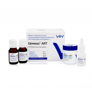 Материал «Цемион-ART» - традиционный стеклоиономерный цемент химического отверждения, обладающий химической адгезией к дентину и эмали. Цемент «Цемион-ART» образуется при смешивании порошка и жидкости. Порошок представляет собой измельченное алюмофторсиликатное стекло, жидкость -