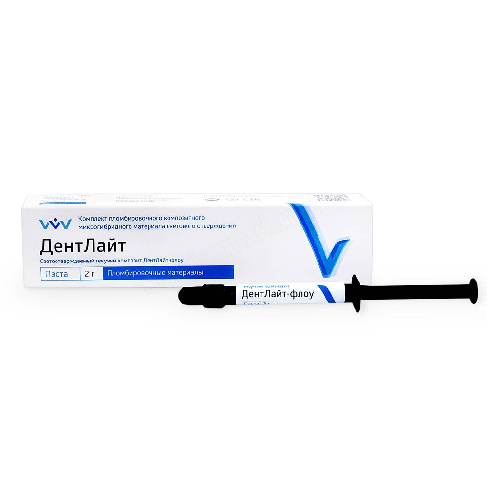 Текучий композитный материал «ДентЛайт» флоу представляет собой низковязкую светоотверждаемую пасту на основе метакрилатных олигомеров и модифицированного тонкодисперсного нанонаполнителя. Рентгеноконтрастный наполнитель представляет собой комбинацию модифицированных барийборалюмосиликатных кластеров (0,1-3 мкм) и наноразмерного диоксида кремния (5-75 нм).