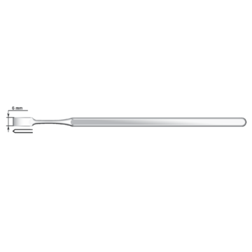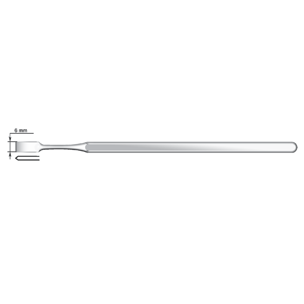 Долото клиновое №4, ширина - 6 мм. Стоматологическое долото используется для сглаживания и/или удаления острых выступающих краев кости, а также часто используются как инструменты для механической обработки кариозных полостей зубов.