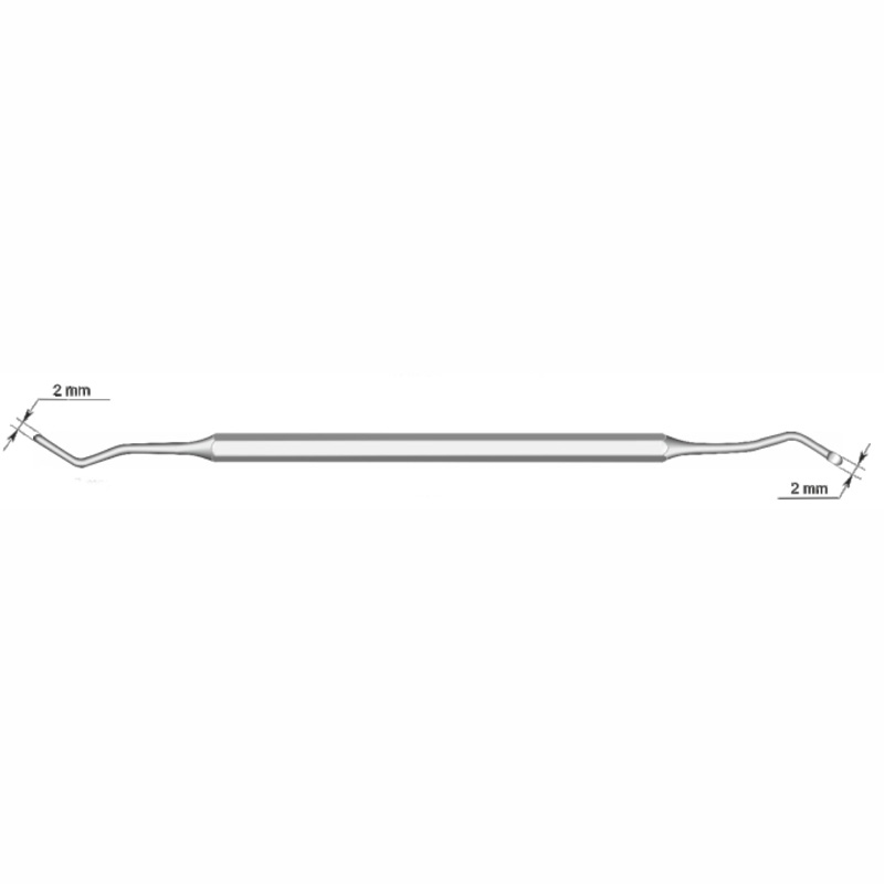 Инструмент предназначен для удаления из кариозной полости остатков пищи, поврежденного дентина, временных пломб, мягкого зубного налета, наддесневых зубных отложений. Длина — 160 мм, две рабочих части в виде лопатки с закругленным концом большого размера.