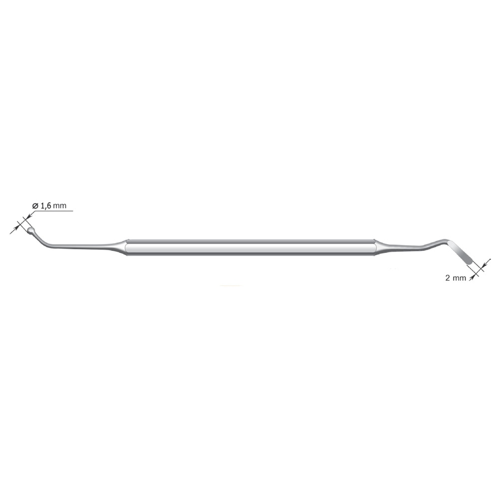 Инструмент предназначен для внесения в обработанные кариозные полости лекарственных прокладок в пастообразном состоянии, уплотнения пломбировочного материала, конденсации его к стенкам полости, а также для формирования пломб. Длина — 157 мм мм, две рабочие части — шаровидная (d - 1,6 мм) и гладилка 2 мм.