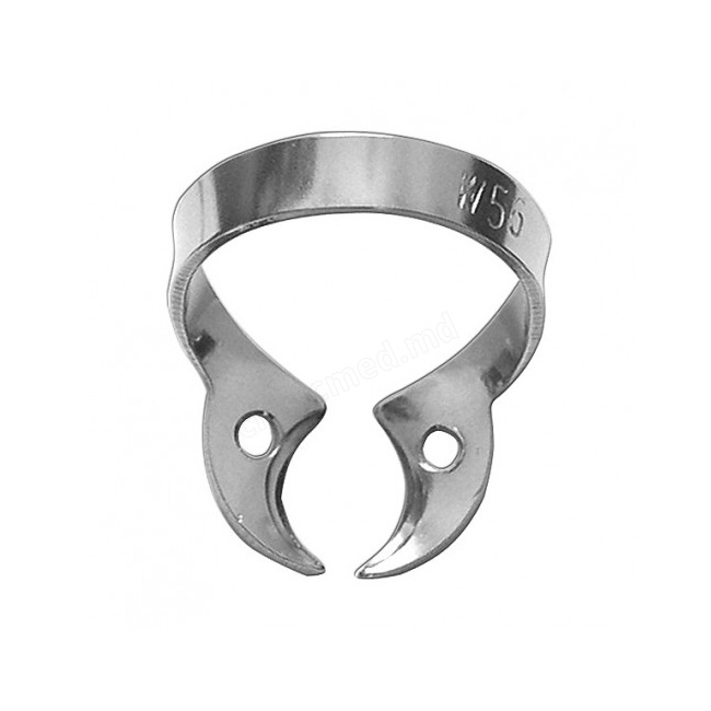 Кламп № W56 - это кламп с жесткими изогнутыми "челюстями" (с глубоким захватом), без крыльев, для нижних моляров с большим размером коронки, используется в том числе при сильном разрушении коронки зуба.
