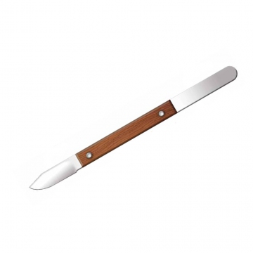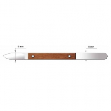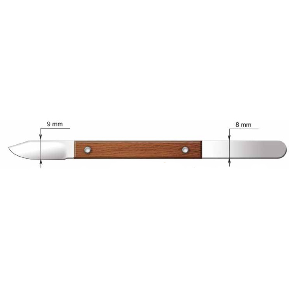 Нож-шпатель зуботехнический малый с деревянной ручкой посередине. Ширина ножа - 9 мм, ширина шпателя - 8 мм.