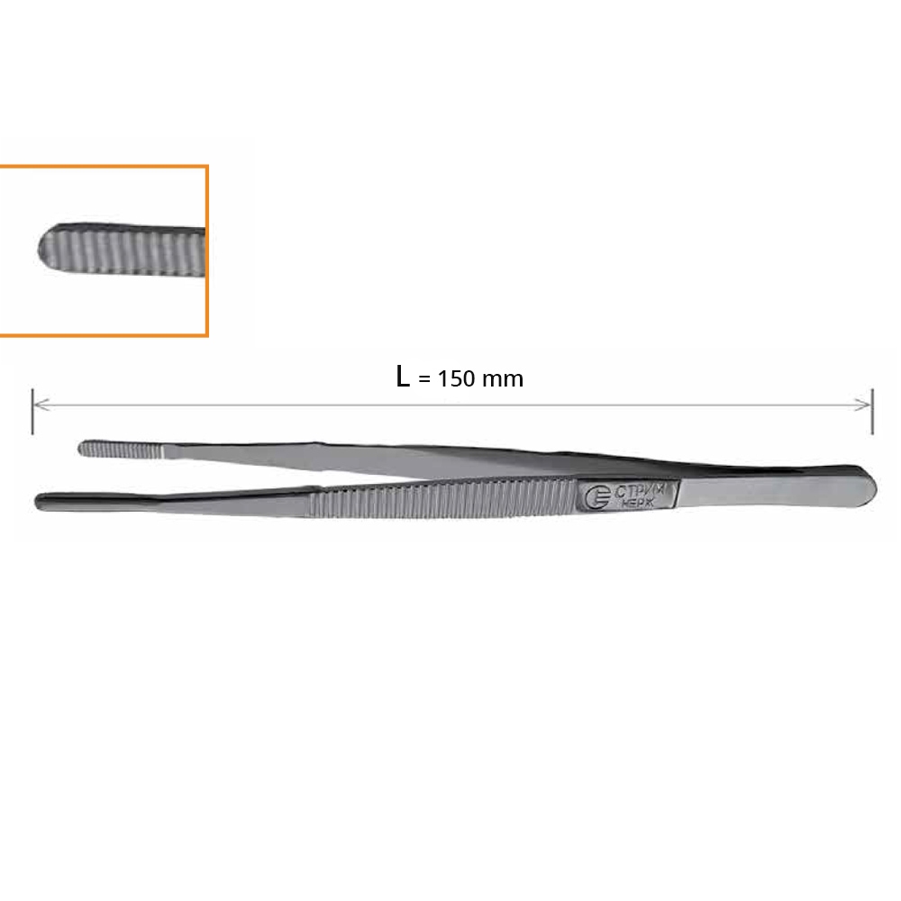 Пинцет 150 мм используется при манипуляциях с чувствительными тканями, которые могут быть подвержены травматизму при достаточно интенсивном и грубом стороннем механическом воздействии. Мягкое воздействие пинцета при способности прочно удерживать нежные ткани обусловлено наличием мелких насечек на конце инструмента на внутренней стороне.