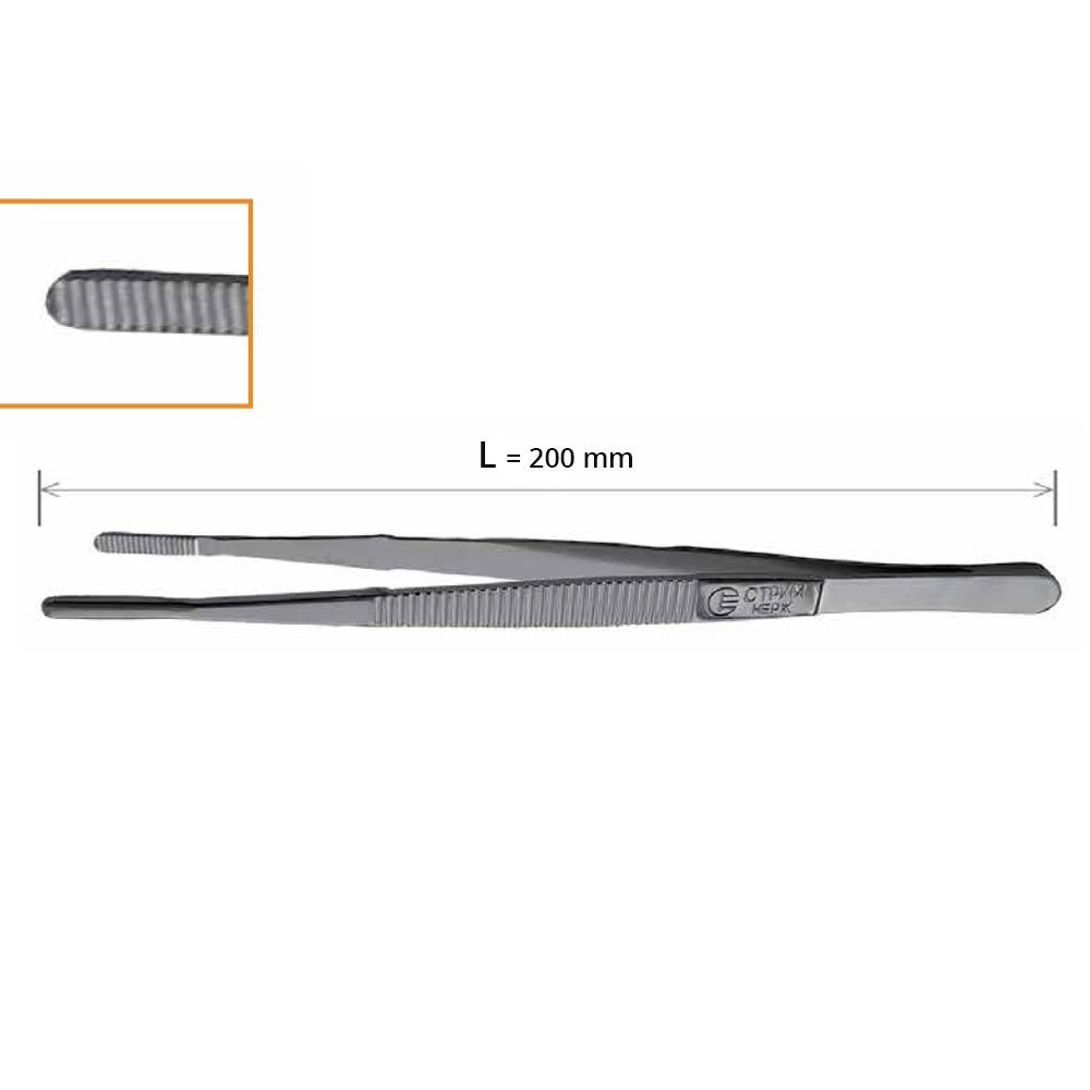 Анатомический пинцет 200 мм изготовлен из высококачественной высоколегированной стали, что обеспечивает данному инструменту долгий срок службы и гарантию от контактов с окружающей внешней средой, способных спровоцировать процессы окисления. Прочная сталь делает пинцет устойчивым к механическому воздействию. Полированная поверхность минимизирует накопление загрязнений на поверхности инструмента, в т. ч. и при наличии на нём небольших механических повреждений. Однако, при появлении трещин и царапин пинцет должен быть заменён на новый в качестве превентивной меры безопасности и соблюдения правил гигиены.