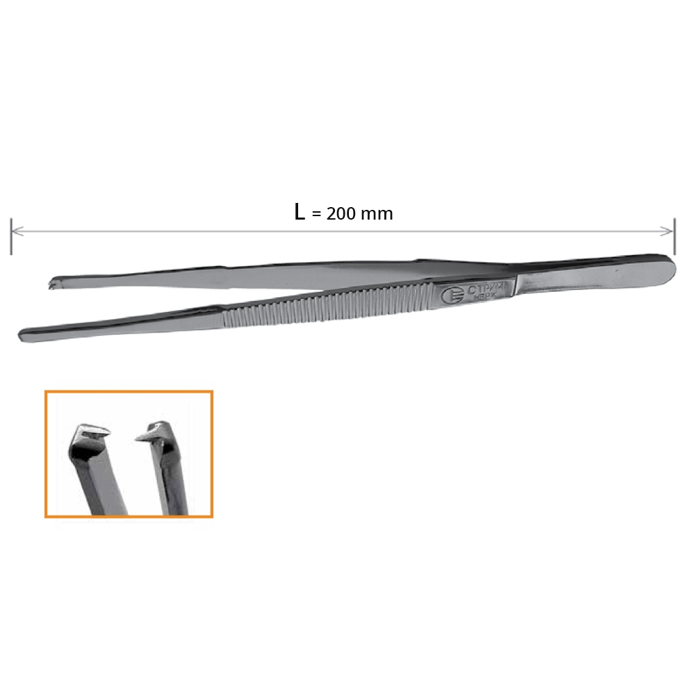 Хирургический пинцет 200 мм изготовлен из высококачественной высоколегированной стали, что обеспечивает данному инструменту долгий срок службы и гарантию от контактов с окружающей внешней средой, способных спровоцировать процессы окисления. Прочная сталь делает пинцет устойчивым к механическому воздействию. Полированная поверхность минимизирует накопление загрязнений на поверхности инструмента, в т. ч. и при наличии на нём небольших механических повреждений. Однако, при появлении трещин и царапин пинцет должен быть заменён на новый в качестве превентивной меры безопасности и соблюдения правил гигиены.
