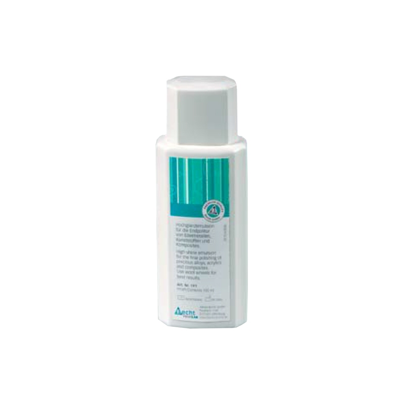 Придающая блеск эмульсия используется для окончательной полировки драгоценных сплавов, акрилатов и композитов. Отличные результаты достигаются за короткий период времени. После полировки поверхность материала становится гладкой и герметичной. Лучший результат достигается при использовании полировочного диска компании Becht, art 292.1.