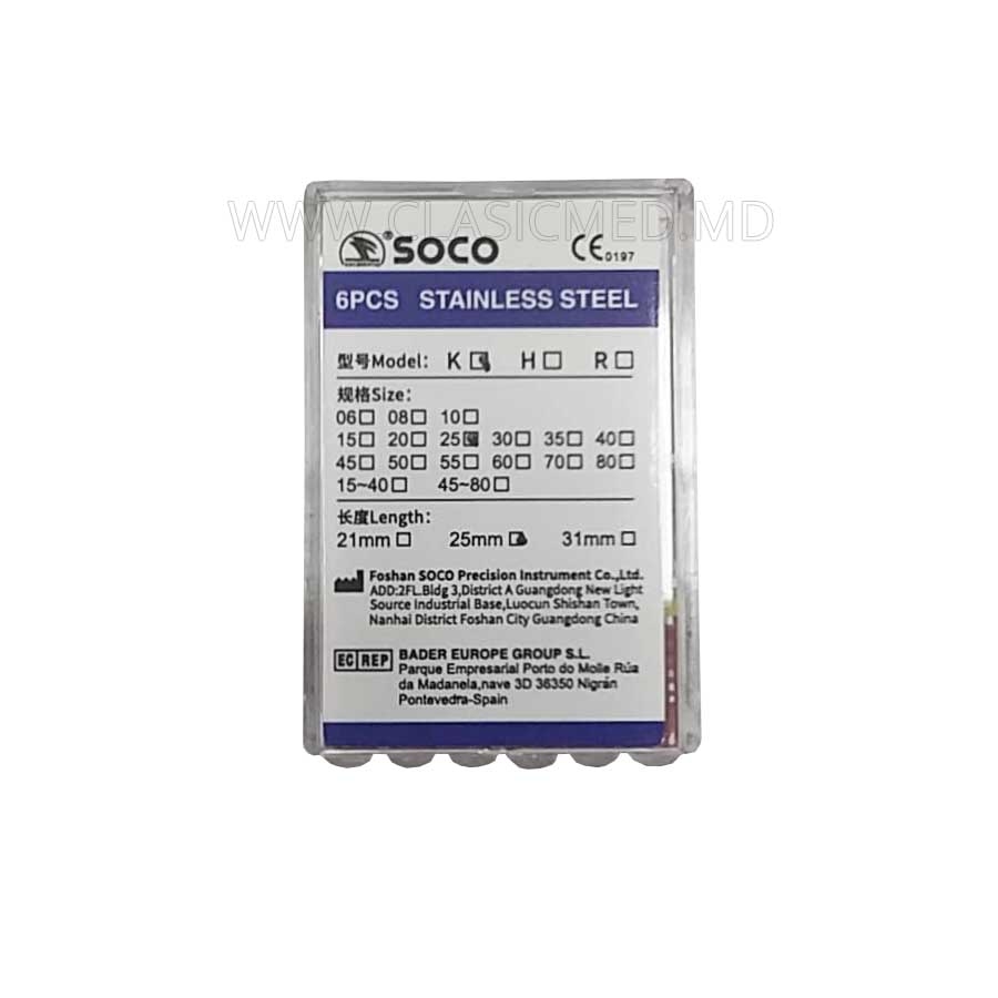К-файлы SOCO SCF-SS #25 из нержавеющей стали для ручного использования. Применяются для расширения и прохождения корневого канала. Обладают средней жесткостью. 25 мм.