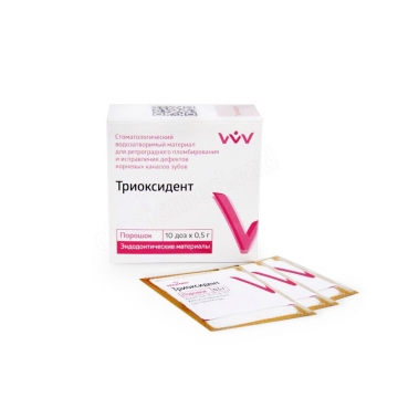 ТРИОКСИДЕНТ (порошок) - это материал для ретроградного пломбирования корневых каналов, закрытия перфорация и других дефектов корневых каналов. Стоматологический водозатворимый материал. Материал на основе оксидов кальция, кремния, алюминия (мта). 10 пакетиков * 0,5 г.